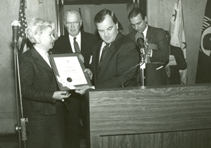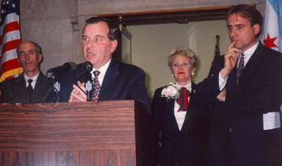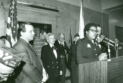 Navy spokesperson Cynthia Panzini commends our veterans as Mayor Daley and Cynthia Simpson look on.