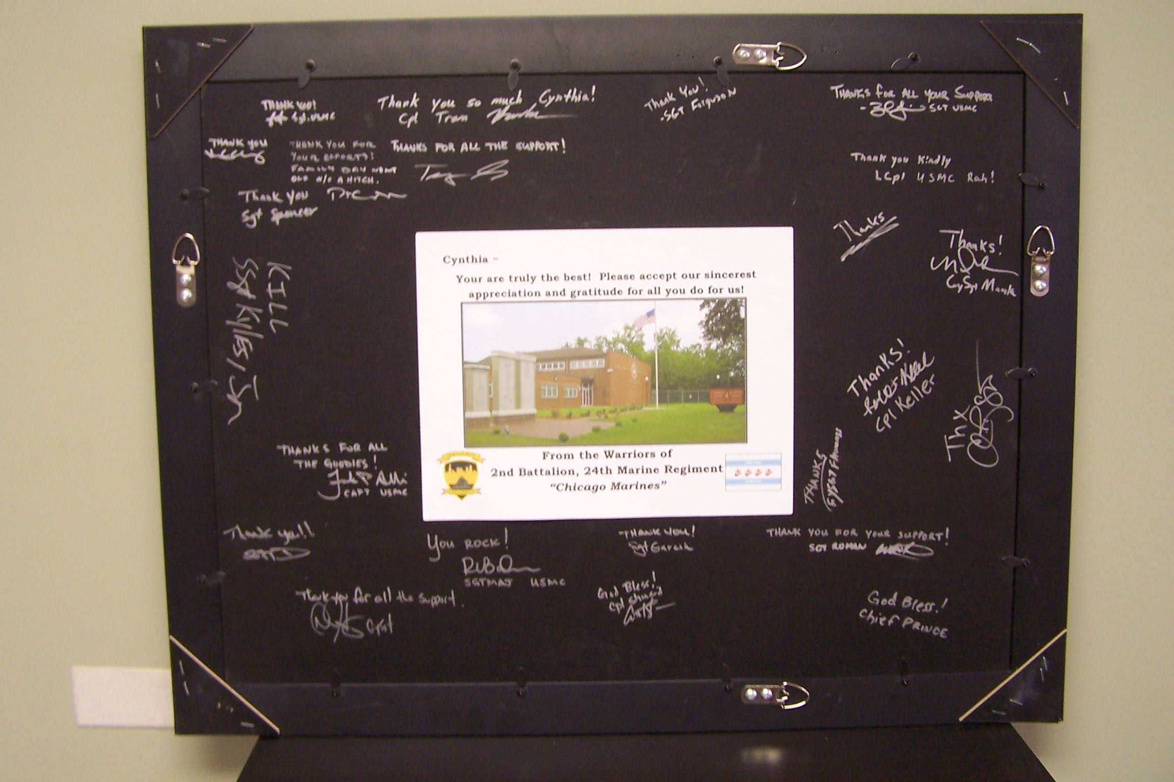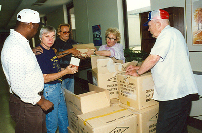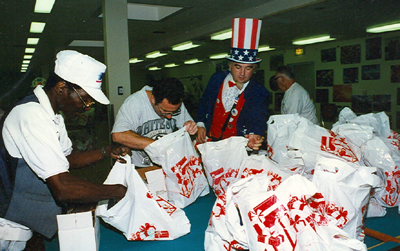 Volunteers unpacking gifts for hospitalized veterans on the 4th of July.