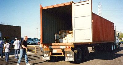Volunteers unpacking gifts for veterans on the 4th of July.